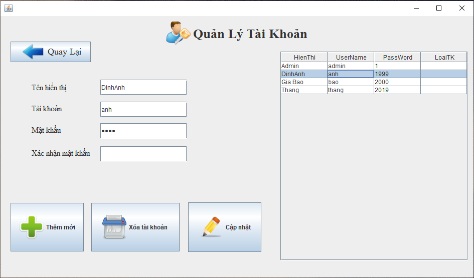Trường HienThi: Trường hiện thị ra tên và password của nhân viên